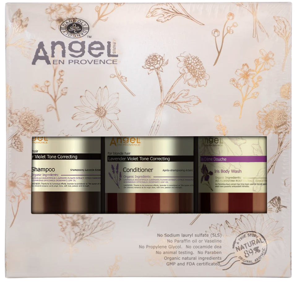 Experience true luxury with our Lavender Gift Pack, featuring Angel En Provence Lavender Violet Tone Correcting Shampoo and Conditioner. These products are scientifically designed to effectively neutralize yellow and brassy tones in blonde hair. For a complete pampering session, this bundle also includes the Iris Restorative Body Wash for gentle cleansing and nourishment. Unwind and indulge with this exclusive gift pack.