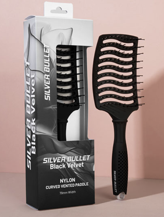 Create hair as smooth and soft as velvet. The Silver Bullet Black Velvet Curved Vent Paddle Hair Brush is ideal for detangling, smoothing, and drying. Its vented design speeds up blow drying for enhanced efficiency, while the curved head contours to the scalp for superior comfort. Featuring durable nylon bristles, this brush delivers luxurious results with ease.