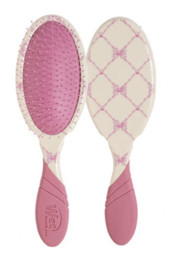 Put a bow on it! WetBrush Pro Bows on Bows Detangler Pink features a limited edition bow design. This is the world famous, award-winning Original Detangler redesigned by stylists for stylists. Revolutionary IntelliFlex bristles diffuse knots on all hair types, wet or dry, gliding through tangles with less effort, less pain and over 55%* less breakage. Ergonomically advanced with finger rests and rubberised EasyGrip handle for more comfort and control. *Independent testing shows IntelliFlex bristles create less breakage than a leading competitor. ** Do not use with hair dryer, as heat may damage the bristles. Use the WetBrush Pro Flex Dry instead.